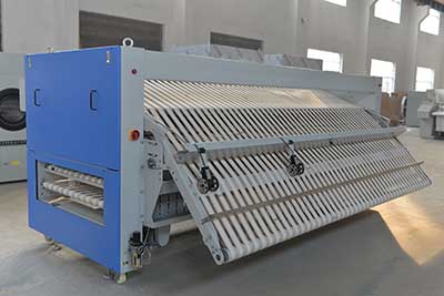 上航洗(xǐ)涤机械床单折叠机(jī)折叠后,层数增加,厚度增加。基本上采(cǎi)用正反转和机械刀盘(pán)结构,能可靠完成布的折叠。一些折叠机采用简单的升降板(bǎn)结构(gòu)折叠四次(cì),但织物由输(shū)送带推出(chū),折叠缝差,织物的厚度大(dà)不相同,因此不推荐使用。